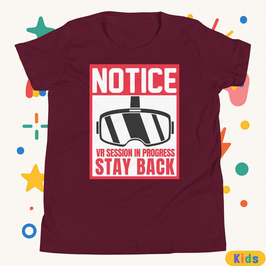 Let everyone know when your young gamer is fully immersed in the virtual world with this playful "Notice VR Session is in Progress Stay Back" T-shirt! Perfect for kids who love VR gaming, this shirt combines humor with a fun warning to give them some space while they explore new...